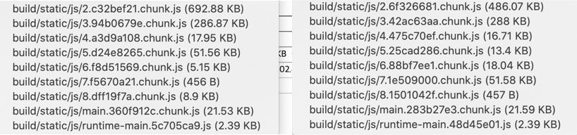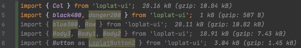 tree shaking이 안되는 버전(v1.2.0)에서 새로 배포한 v.1.2.1을 적용했더니, 리액트 프로젝트(loplat x mobile) 번들링 용량이 200KB가량 감소했다. v1.2.0(왼쪽) vs v1.2.1(오른쪽, tree shaking 적용)
