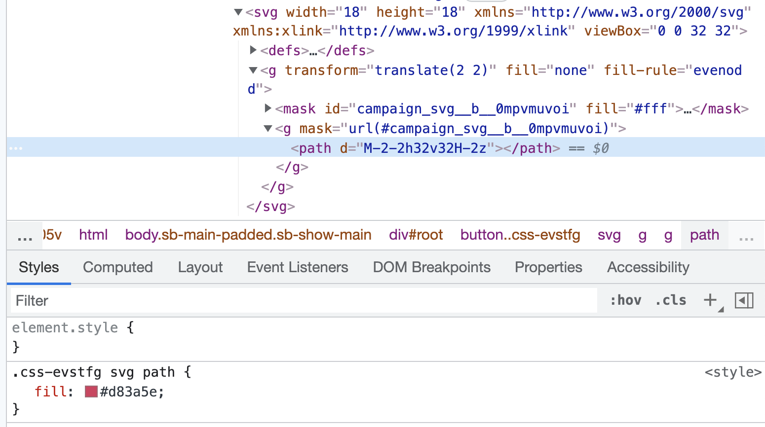 svg mask(https://developer.mozilla.org/en-US/docs/Web/SVG/Element/mask)는 fill="white"일 때 mask가 덮고 있는 영역이 모두 보이고, fill="black" 일때는 mask가 덮고 있는 영역이 보이지 않게 된다. 즉, 정사각형(d="M-2-2h32v32H-2z") 영역 중에서, Icon에 해당하는 path만 보이고 나머지는 보이지 않도록 mask가 작동해야한다. 정사각형의 색상이 원래 원하던 색상이므로, Icon에 해당하는 path(즉, mask안에 있는 campaign_svg__a path) 의 fill 값은 'white'여야한다. 하지만 현재는 모든 path의 색상이 빨간색(white와 black의 중간)이므로 원하던 색상보다 조금 연하게 보였던 것이다.(완전히 보이지도(white) 숨겨지지도(black) 않은 중간 상태)