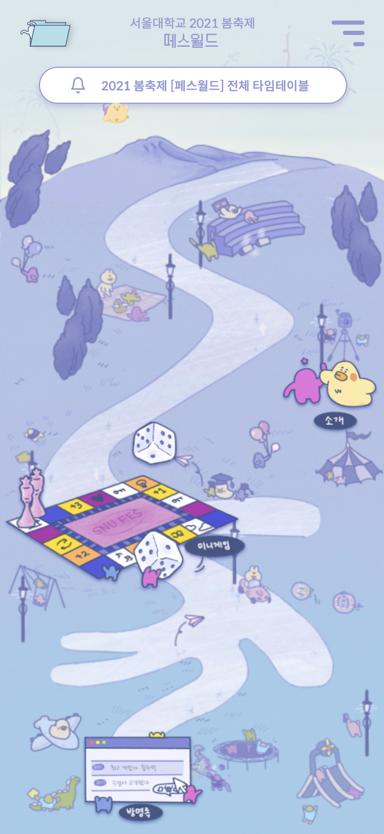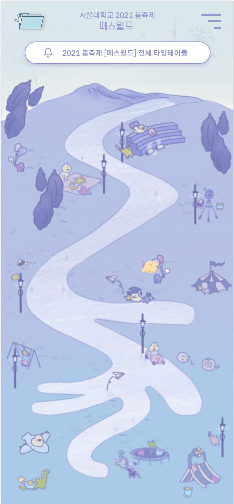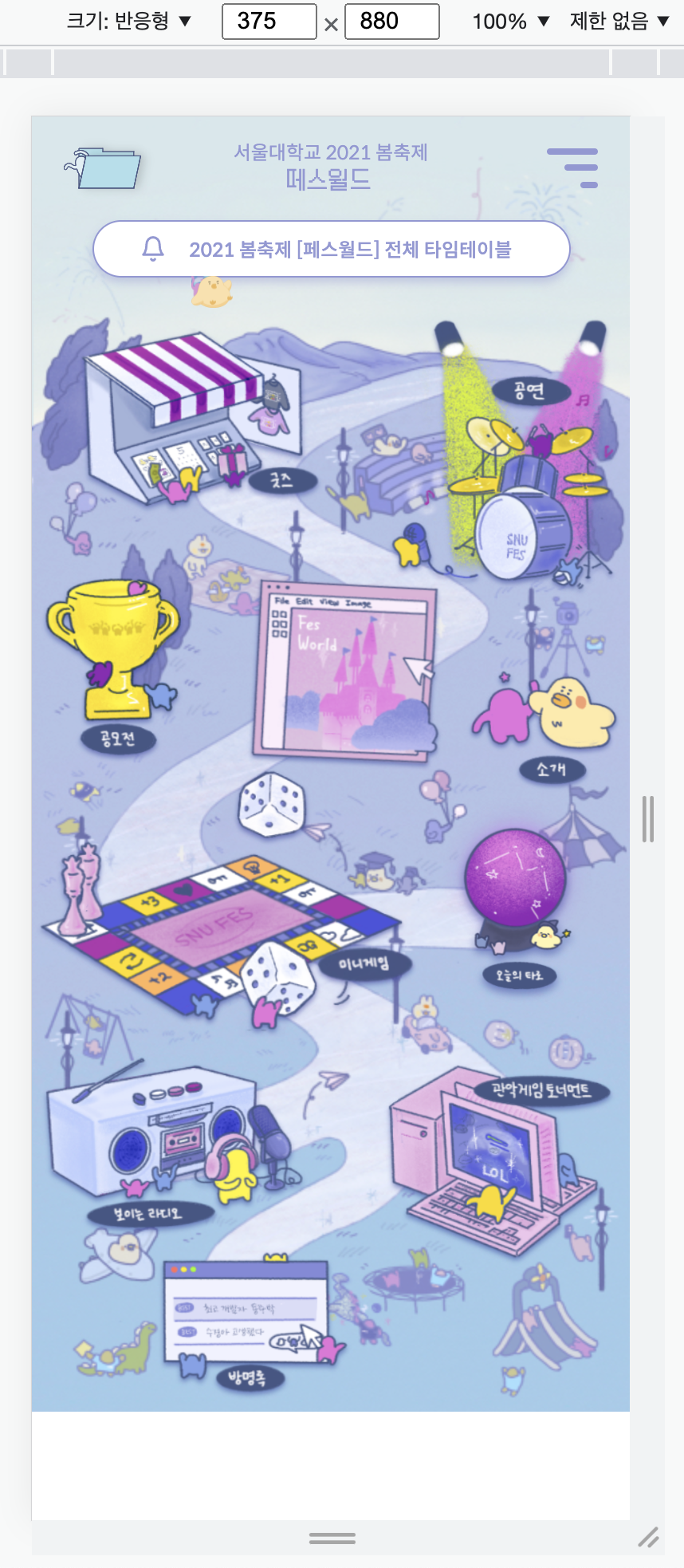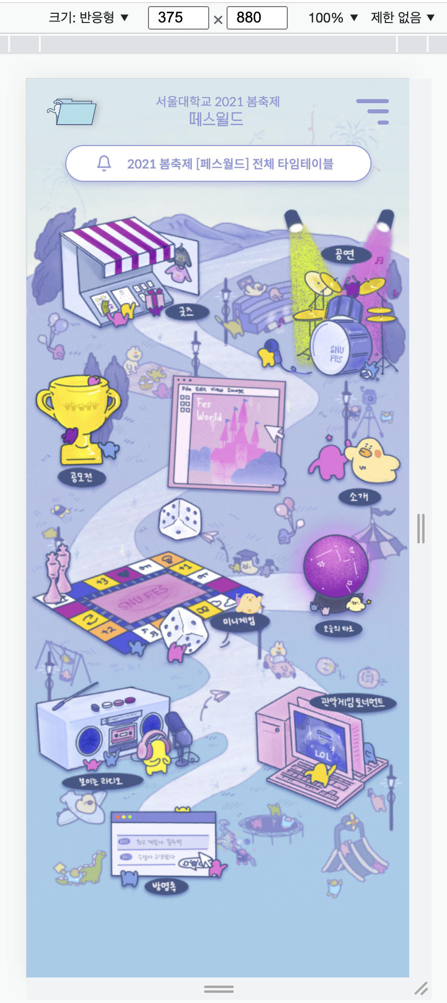 - 보통 화면 레이아웃은 flex, grid 등의 css 속성을 이용하지만 축제 메인화면이라는 특수한 상황에 맞도록 디자이너와 함께 레이아웃을 고민했다. 결과적으로 아래와 같은 디자인이 확정되었다.