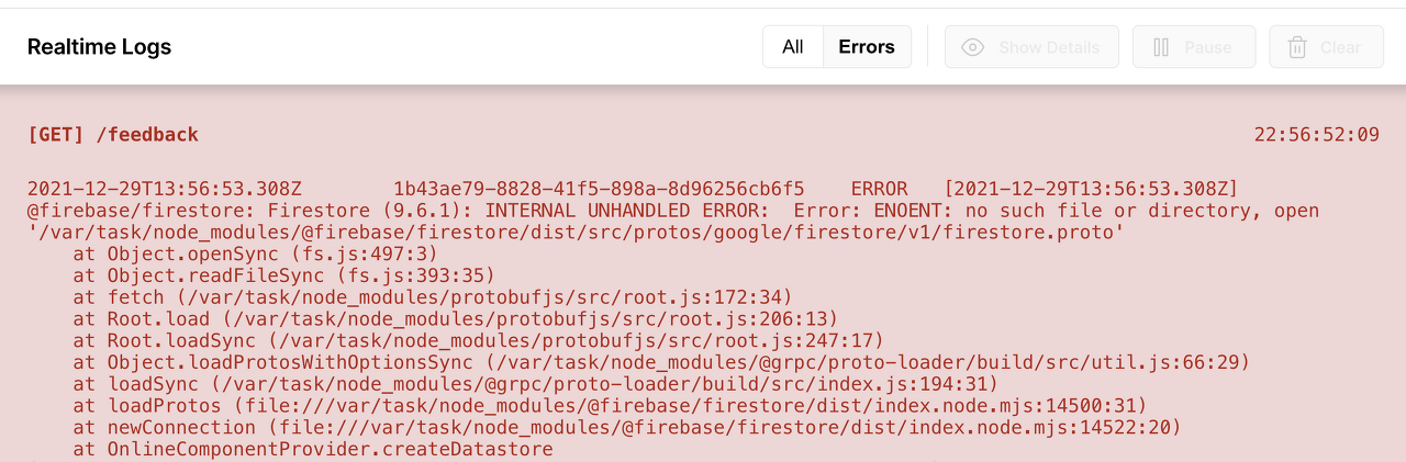 하지만 500에러 인것으로 보아 getServerSideProps 도중에 오류가 나 pre-render에 실패한 것이라고 추측은 가능했다. - firebase에서 원인을 알 수 없는 오류가 난 것으로 보고, getFeedbackListFromFirestore 함수에 try/catch문을 감싸보았지만 문제는 여전했다.