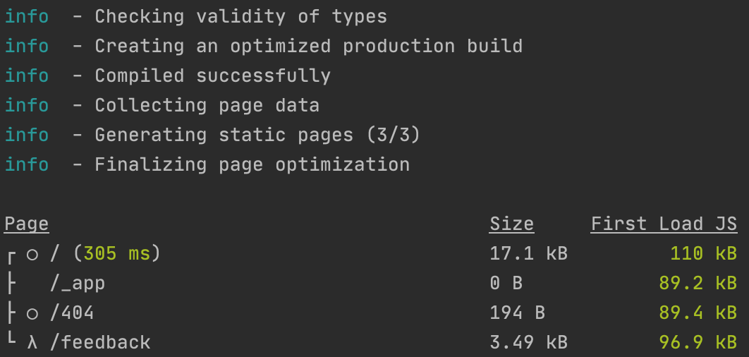 // firebase/index.ts import { initializeApp } from '@firebase/app'; import { getFirestore } from '@firebase/firestore'; initializeApp({ apiKey: process.env.NEXT_PUBLIC_FIREBASE_API_KEY, authDomain: process.env.NEXT_PUBLIC_FIREBASE_AUTH_DOMAIN, databaseURL: process.env.NEXT_PUBLIC_FIREBASE_DATABASE_URL, projectId: process.env.NEXT_PUBLIC_FIREBASE_PROJECT_ID, storageBucket: process.env.NEXT_PUBLIC_FIREBASE_STORAGE_BUCKET, messagingSenderId: process.env.NEXT_PUBLIC_FIREBASE_MESSAGING_SENDER_ID, appId: process.env.NEXT_PUBLIC_FIREBASE_APP_ID, }); export const firestore = getFirestore(); - 그 후 Next.js의 getServerSideProps에서 firestore의 feedback 데이터를 불러와 pre-render한다.