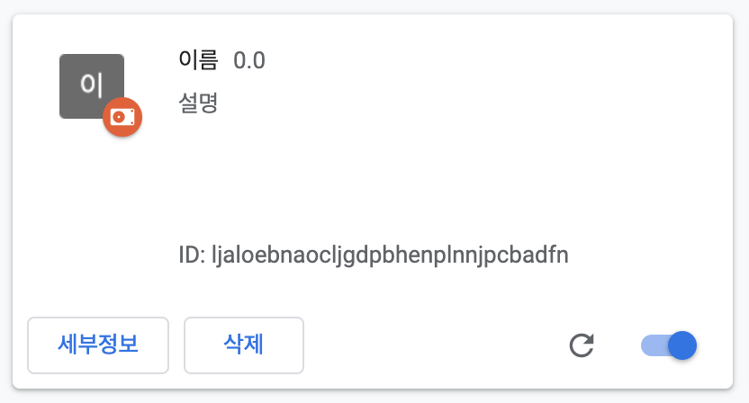 그 후, chrome 주소창에 'chrome://extensions/'을 입력하고 확장 프로그램 페이지로 들어간다. 오른쪽 상단의 '개발자 모드'를 켜고 '압축해제된 확장 프로그램을 로드합니다.'를 클릭하여 방금 만든 폴더를 불러온다. 그러면 새로운 확장 프로그램이 추가된 것을 확인할 수 있다.