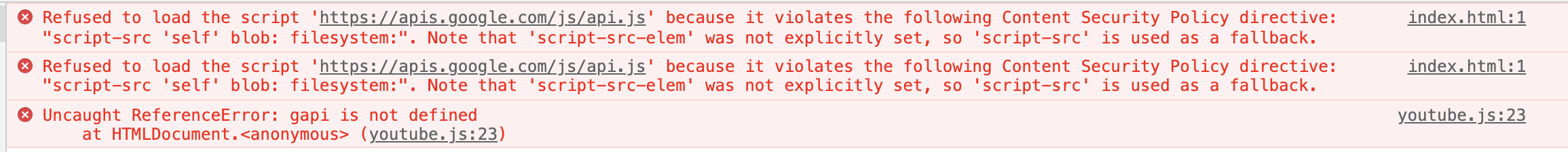 <script defer src="https://apis.google.com/js/api.js"></script> <script defer src="youtube.js"></script>