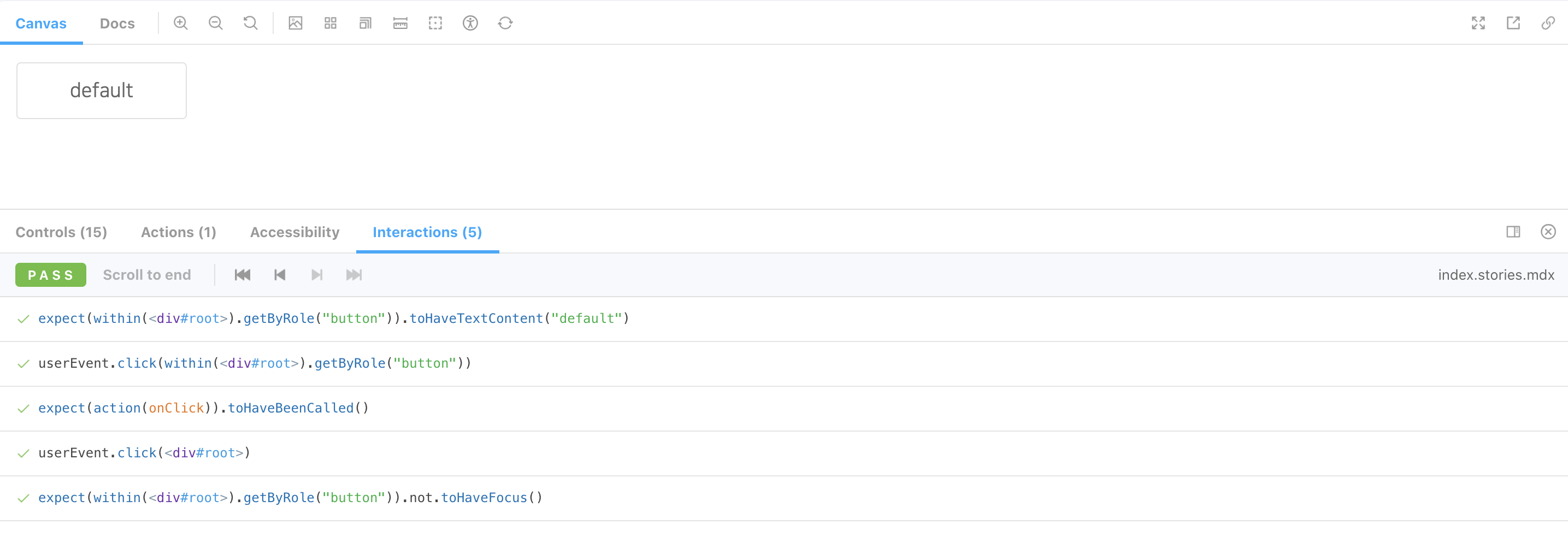 // Button/index.stories.mdx import { runTest } from './storybookTest.ts' ... export const Template = (args) => <Button {...args} />; ... <Canvas> <Story name="default" args={{ children: 'default', role: 'button' }}> {runTest(Template.bind({}))} </Story> </Canvas>