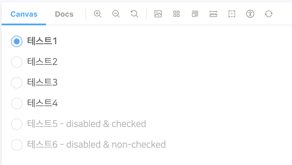 따라서 storybook test code를 담고 있는 wrapper function을 'storybookTest.ts' 파일에 작성하고, 해당 함수를 mdx/csf storybook file에 import하여 기존의 스토리를 wrapper function으로 감싸는 방식을 취하기로 한다.(다음 단계에서 자세히 설명) - 먼저 일반적으로 많이 쓰이는 csf(Component Story Format) story를 예로 설명한다. loplat UI의 RadioButton story가 csf 방식으로 작성되어 있다. (https://loplat-ui.web.app/?path=/story/components-radiobutton-group--default-story)
