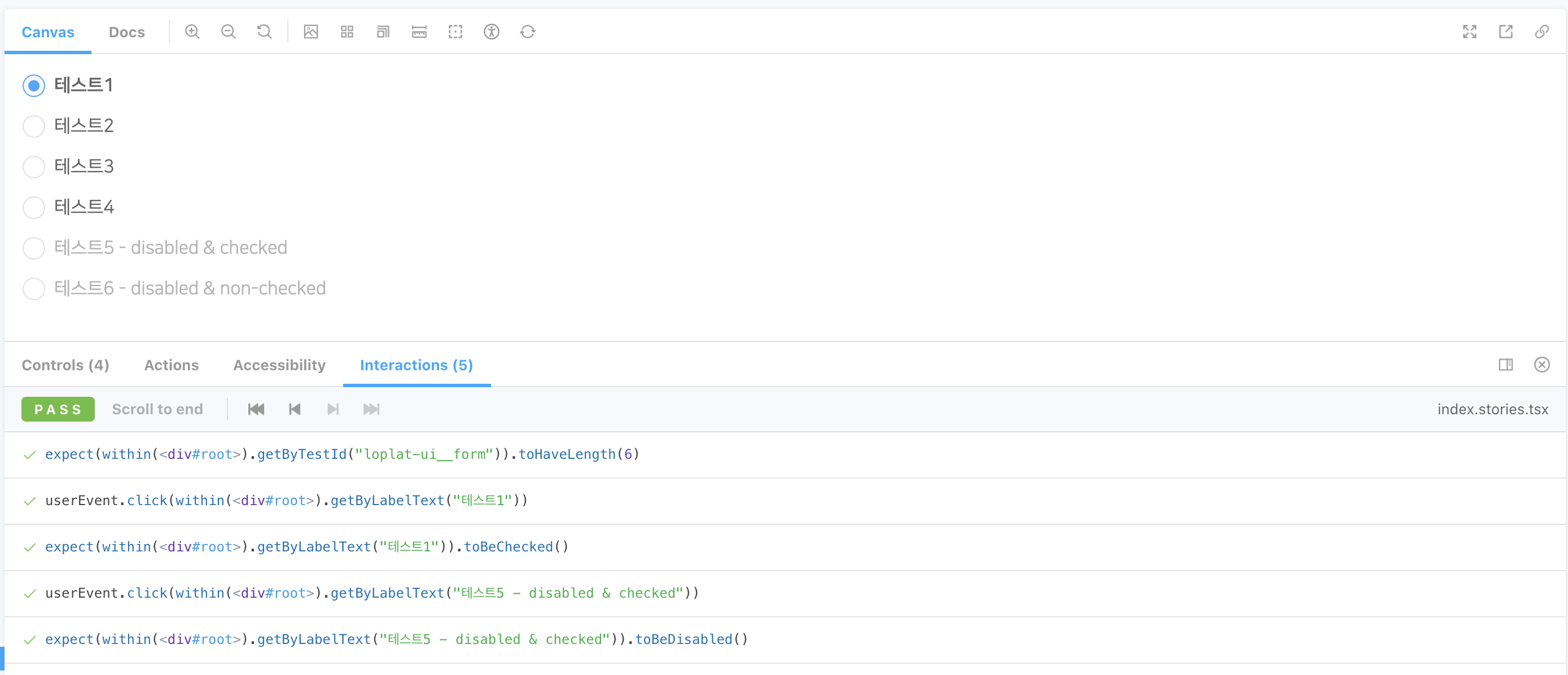 이제 storybook을 실행하면 Interactions addon tab이 생기고, 자동으로 테스트 코드가 실행된다!