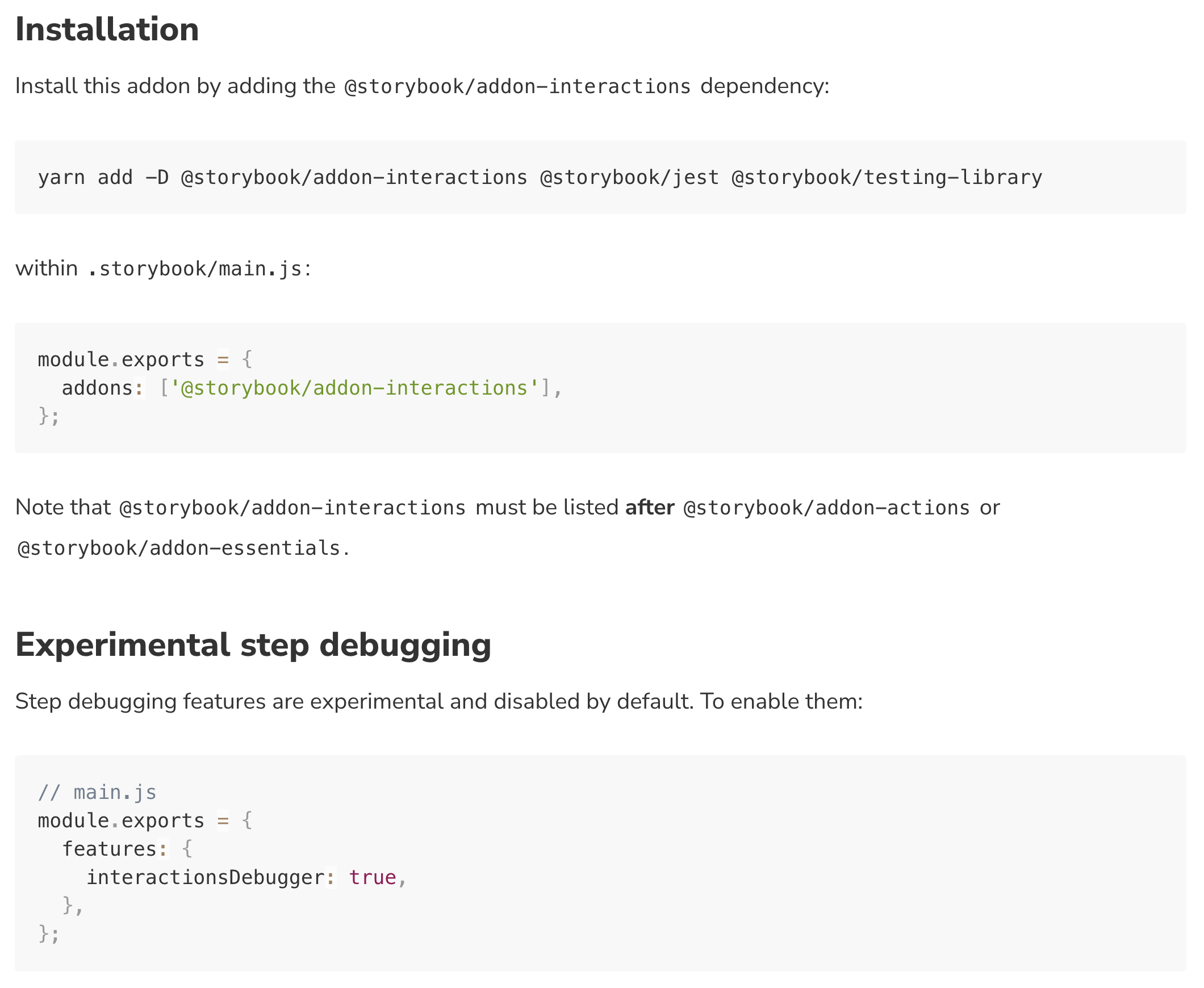 - interactions addon(https://storybook.js.org/docs/essentials/interactions) 공식 문서에 나와있는대로 패키지 설치와 기본 configuration 설정을 완료한다.