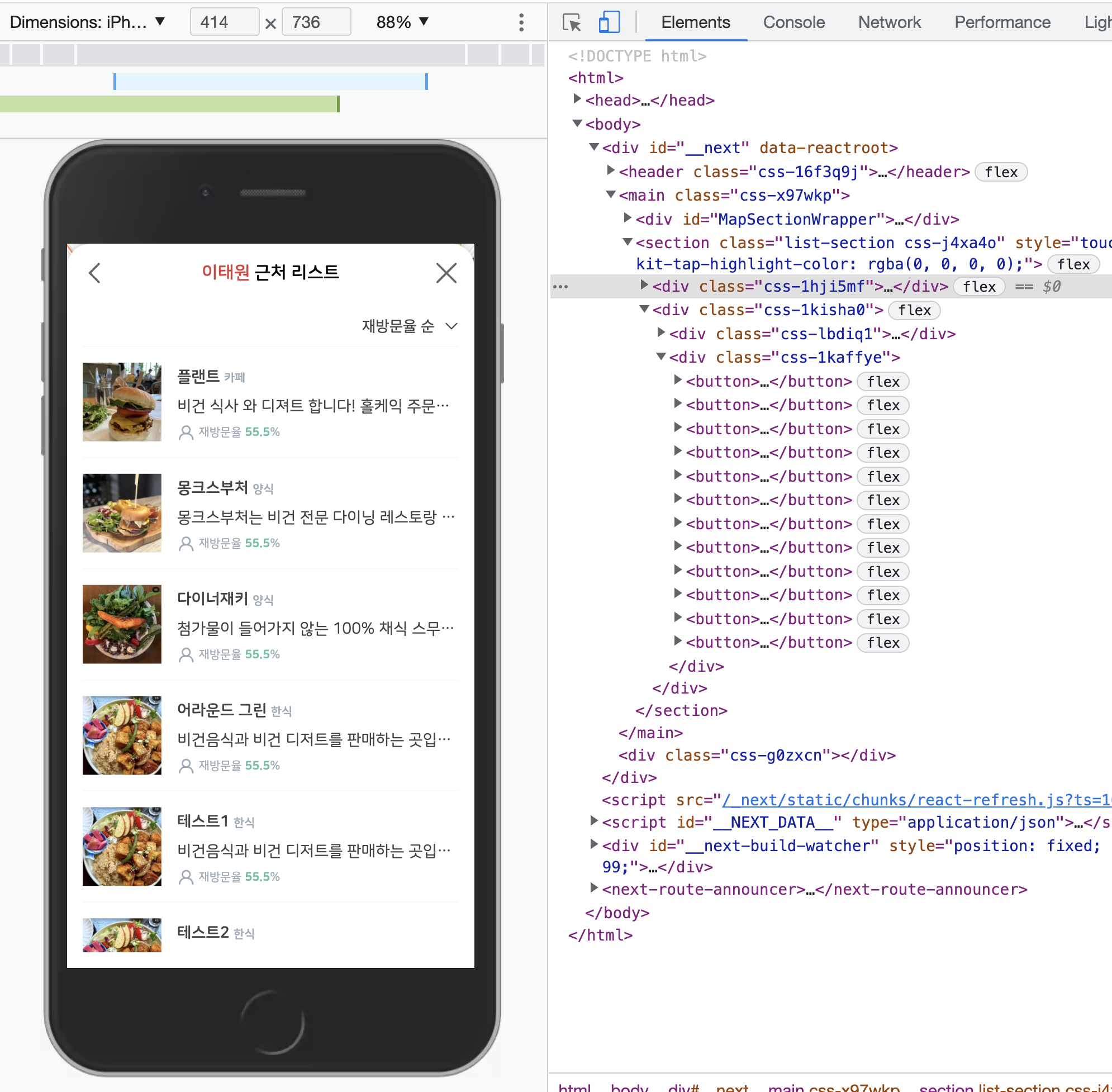 기존에는 StoreList라는 이름의 'div' 태그 하위에 각 매장 Row(button)를 렌더링했다.