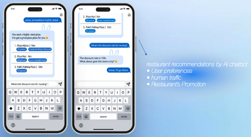 메인 기능인 채팅 UI를 개발했다. AI가 식사 메뉴를 추천해주고 포장 주문을 유도하는 대화를 진행한다. 챗봇은 OpenAI GTP API를 사용했고 백엔드 개발자가 프롬프트 엔지니어링을 통해 상황에 맞는 응답값을 보내주었다. 나는 유저가 작성하는 input string과 백엔드에서 보내주는 AI의 응답값을 상태로 관리했다. 말풍선 CSS를 적용하고 채팅을 작성하면 스크롤을 최하단으로 내리는 기능 등도 구현했다.채팅 UI