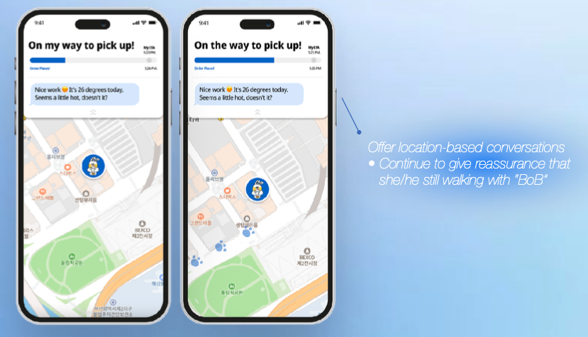 해결할 문제와 원인을 알게되니, 무엇을 구현해야할지가 자연스럽게 정해졌다. AI 챗봇을 이용하여 은둔형 외톨이와 대화를 진행하고, 그 과정에서 식사 시간에 맞추어 포장 주문을 유도하는 핵심 시나리오가 그려졌다. 또한 매장을 방문하는 과정 안에서도 알림을 통해 지속적으로 격려의 말을 건네고 포장 경험을 좋은 기억으로 남게 해주기 위한 UX를 고민했다.